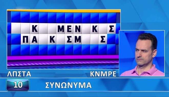 Η κατηγορία ήταν «Συνώνυμα» όπως ανακοίνωσε κι η Νατάσα Κουβελά, με τα γράμματα Λ, Π, Σ, Τ, Α να βγαίνουν στον πίνακα. Ο παίκτης από την πλευρά του είπε το Κ, το Ν, το Μ κι έξτρα σύμφωνο το Ρ, ενώ για φωνήεν επέλεξε το Ε.