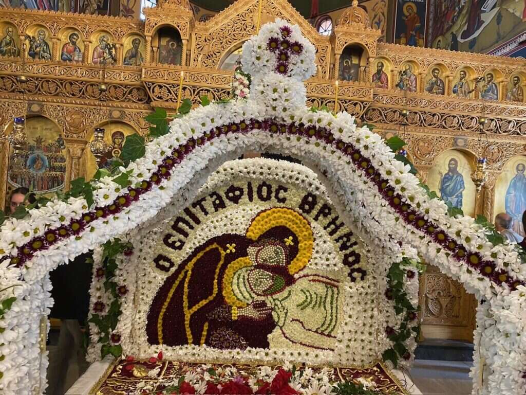 Πρωταγωνιστικό ρόλο στον στολισμό φαίνεται να έχουν τα χρυσάνθεμα, ενώ στο φόντο του έχει σχεδιαστεί ο Επιτάφιος Θρήνος, η στιγμή όπου η Μεγαλόχαρη σκύβει στο κεφάλι του παιδιού της και θρηνεί τον θάνατό του. Με λουλούδια αναγράφεται και η φράση: “Ο Επιτάφιος Θρήνος“.