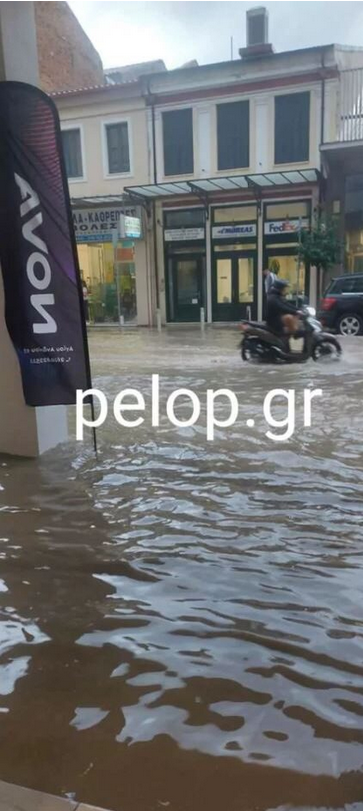 Όπως αναφέρει το pelop.gr, η οδός Αγίου Ανδρέου, μετατράπησε σε «λίμνη» με τη στάθμη του νερού να ανεβαίνει επικίνδυνα και να φτάνει μέχρι τις εισόδους καταστημάτων. Ανάλογη η κατάσταση και σε άλλους κεντρικές οδικές αρτηρίες, με την κυκλοφορία των οχημάτων να πραγματοποιείται με δυσκολία.