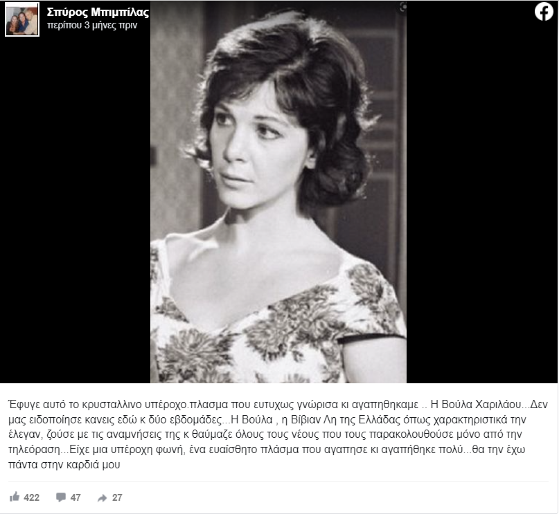Κλείνοντας, η Βούλα Χαριλάου που άφησε ιστορία πίσω της. Έγινε πολύ αγαπητή και το ταλέντο της ξεχώρισε.