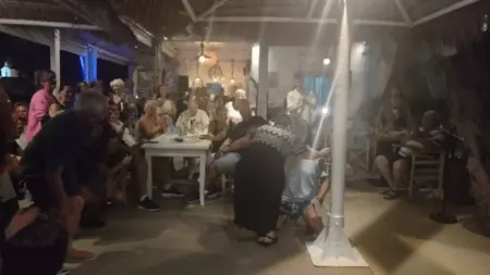 Ο Δημήτρης Μπάσης εντυπωσιάστηκε από το συγκρότημα των Συριανών μουσικών, Γιάννη Σολάρη, Αλέξανδρου Μήτση και Ανδρέα Κόνταρη, ενώ δέχτηκε και ο ίδιος… παραγγελιές από τους θαμώνες, στους οποίους δεν θέλησε να χαλάσει χατίρι. Μεταξύ αυτών και η κυρά Βαγγελιώ, που χόρεψε ζεϊμπέκικο, με τον γνωστό τραγουδιστή να… υποκλίνεται στις χορευτικές της ικανότητες.