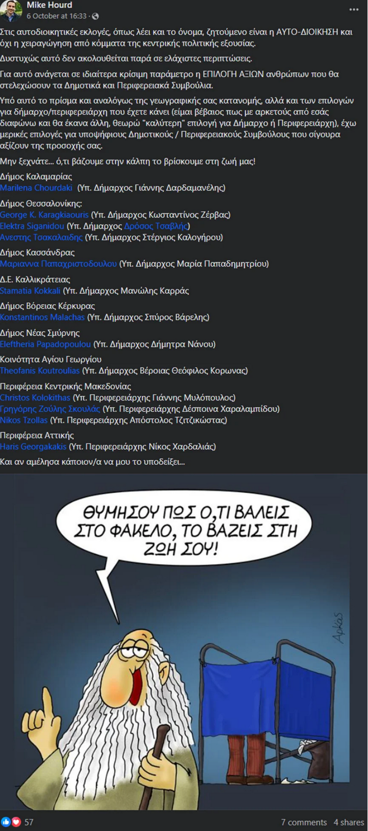«Υπό αυτό το πρίσμα και αναλόγως της γεωγραφικής σας κατανομής, αλλά και των επιλογών για δήμαρχο/περιφερειάρχη που έχετε κάνει (είμαι βέβαιος πως με αρκετούς από εσάς διαφώνω και θα έκανα άλλη, θεωρώ “καλύτερη” επιλογή για Δήμαρχο ή Περιφερειάρχη), έχω μερικές επιλογές για υποψήφιους Δημοτικούς / Περιφερειακούς Συμβούλους που σίγουρα αξίζουν της προσοχής σας.