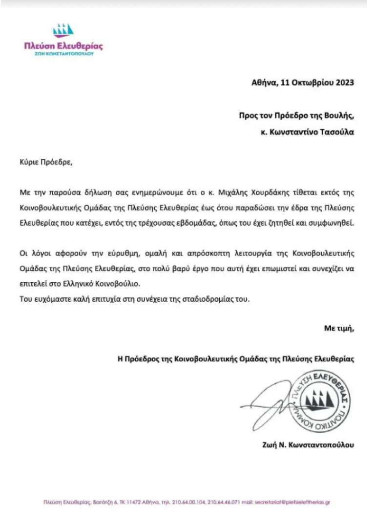 Νωρίτερα το μεσημέρι της Τετάρτης με επιστολή της προς τον Πρόεδρο της Βουλής Κωνσταντίνο Τασούλα, η επικεφαλής της Πλεύσης Ελευθερίας Ζωή Κωνσταντοπούλου, γνωστοποίησε την διαγραφή του βουλευτή της, Μιχάλη Χουρδάκη. Μάλιστα, η κυρία Κωνσταντοπουλου, αναφέρει ότι ο κ. Χουρδάκης θα παραδώσει την έδρα που κατέχει έως το τέλος της εβδομάδας «όπως έχει ζητηθεί και συμφωνηθεί». «Οι λόγοι αφορούν την εύρυθμη, ομαλή και απρόσκοπτη λειτουργία της ΚΟ», σημειώνει και καταλήγει ευχόμενη, «καλή επιτυχία στη συνέχεια της σταδιοδρομίας του».