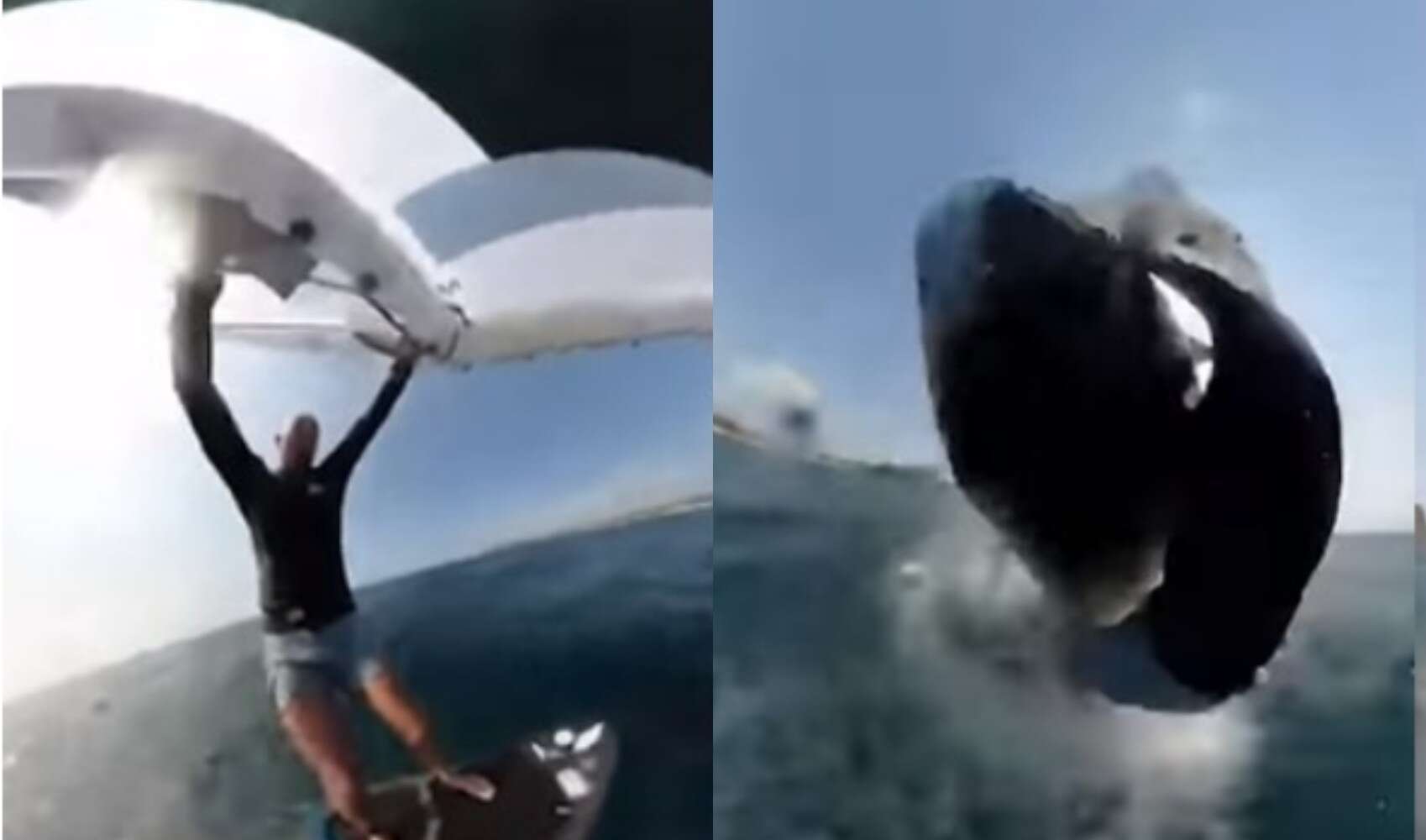 Τα συγκλονιστικά πλάνα, τα οποία καταγράφηκαν από κάμερα που είχε πάνω του ο Μπριν, τον δείχνουν να κάνει σερφ όταν ξαφνικά, η φάλαινα σκάει δίπλα του, τον αναποδογυρίζει και τον βυθίζει μέσα στο νερό.