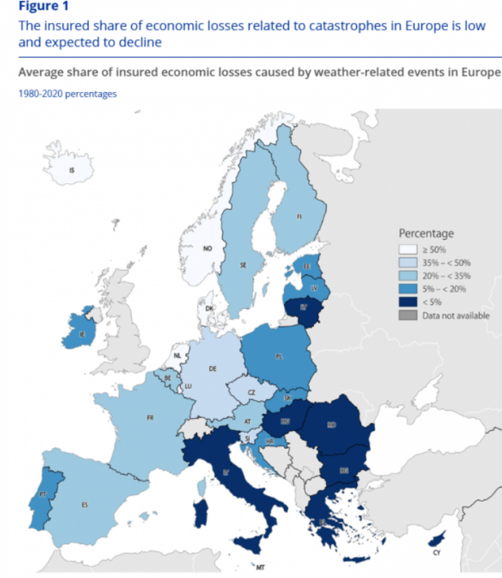 Οι δύο θεσμοί τονίζουν ότι η ασφαλιστική κάλυψη για κλιματικούς κινδύνου είναι χαμηλή καθώς αφορά μόνο στο 25% των ζημιών από φυσικές καταστροφές σε μία περίοδο που οι κίνδυνοι αυτοί αυξάνονται λόγω της κλιματικής αλλαγής. Σε ορισμένες χώρες της ΕΕ, μεταξύ των οποίων και η Ελλάδα, η ασφαλιστική προστασία από ζημιές λόγω κλιματικών καταστροφών την περίοδο 1980 -2020 ήταν χαμηλότερη από το 5% καθώς πολύς κόσμος υποεκτιμά το κόστος τους, ενώ αρκετοί αποφεύγουν την ασφάλιση προτιμώντας να βασίζονται στην κρατική στήριξη, σημειώνουν οι δύο φορείς.