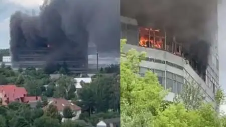 Οπτικό υλικό που αναρτήθηκε στα μέσα κοινωνικής δικτύωσης δείχνει έντρομους ανθρώπους να σπάνε τα τζάμια των παραθύρων καθώς μαύρος καπνός υψώνεται πάνω από το κτίριο ενώ φλόγες έχουν τυλίξει τους πρώτους ορόφους του.