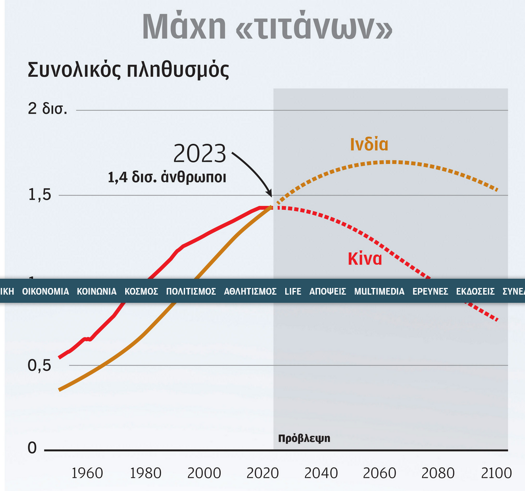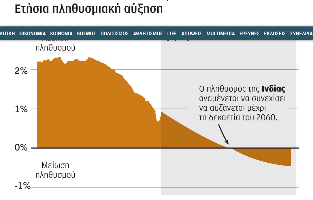 – Οι δύο χώρες επιδίωξαν στο παρελθόν να περιορίσουν την αύξηση του πληθυσμού τους, αν και μόνο η Κίνα επέβαλε περιορισμούς στις γεννήσεις. Οι μέθοδοι αυτές, όμως, εγκαταλείφθηκαν οριστικά. Η δημογραφική άνοδος της Ινδίας προκαλεί, στο μεταξύ, τον φθόνο πολλών ανεπτυγμένων κρατών με γερασμένο πληθυσμό. Οι Ινδοί ζουν περισσότερο, χωρίς το ποσοστό της γεννητικότητας να έχει υποχωρήσει στο παραμικρό τα τελευταία χρόνια. Σε αντίθεση με την Κίνα, η Ινδία δεν αντιμετωπίζει τις επιπτώσεις τής «πολιτικής τού ενός παιδιού». Παρότι η Ινδία πλήττει βάναυσα το περιβάλλον προκειμένου να σιτίσει τον πληθυσμό της, η άνοδος του βιοτικού επιπέδου προστατεύει από φαινόμενα όπως οι λιμοί του παρελθόντος και κάνει πολλούς να μιλούν για «αιώνα της Ινδίας».