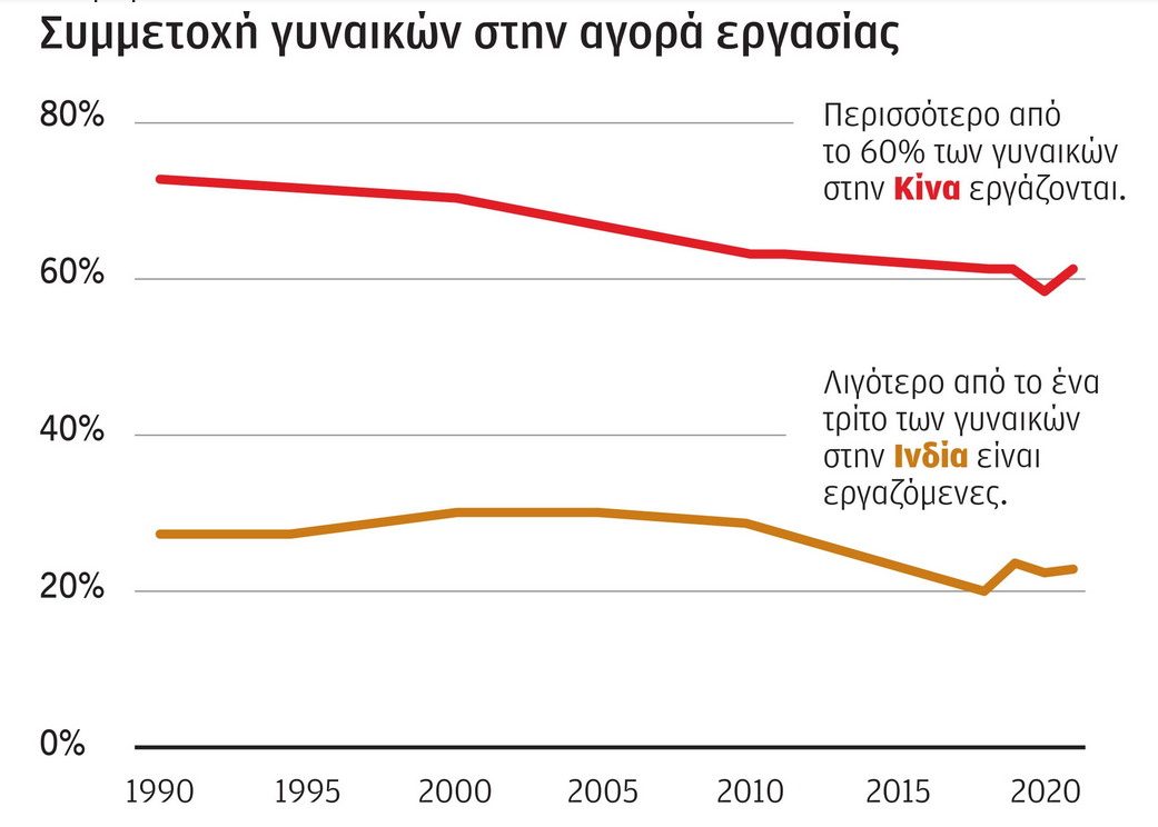 – Η Ινδία εμφανίζει ένα από τα χαμηλότερα ποσοστά γυναικείας απασχόλησης στον κόσμο, ξεπερνώντας ελάχιστα το 20%. Το ποσοστό εργαζόμενων γυναικών στην Κίνα είναι διπλάσιο, υψηλότερο από αυτό των ΗΠΑ και του παγκόσμιου μέσου όρου. Πολύ ανησυχητική είναι η υποχώρηση του ποσοστού γυναικών στην αγορά εργασίας στην Ινδία, παρά τη βελτίωση του βιοτικού επιπέδου. Οικονομολόγοι αποδίδουν το φαινόμενο στις ιδιαίτερα χαμηλές αμοιβές για την εργασία των γυναικών στην Ινδία, που πείθουν τις Ινδές να εγκαταλείψουν τις δουλειές τους αμέσως μόλις το εισόδημα της οικογένειας το επιτρέψει.Μήπως αρχίζει ο «αιώνας της Ινδίας»;