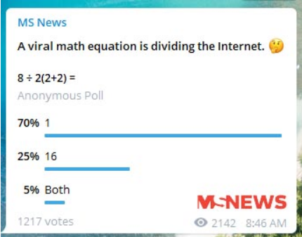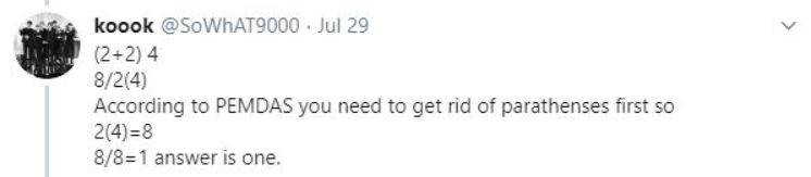 Εφαρμόζοντας αυτόν τον κανόνα, οι χρήστες λαμβάνουν 1 επειδή επιλύουν τα πάντα αφαιρώντας πρώτα τις παρενθέσεις. Ως εκ τούτου, 8 ÷ 2 (2 + 2) = 8 ÷ 2 (4) = 8 ÷ 8 = 1