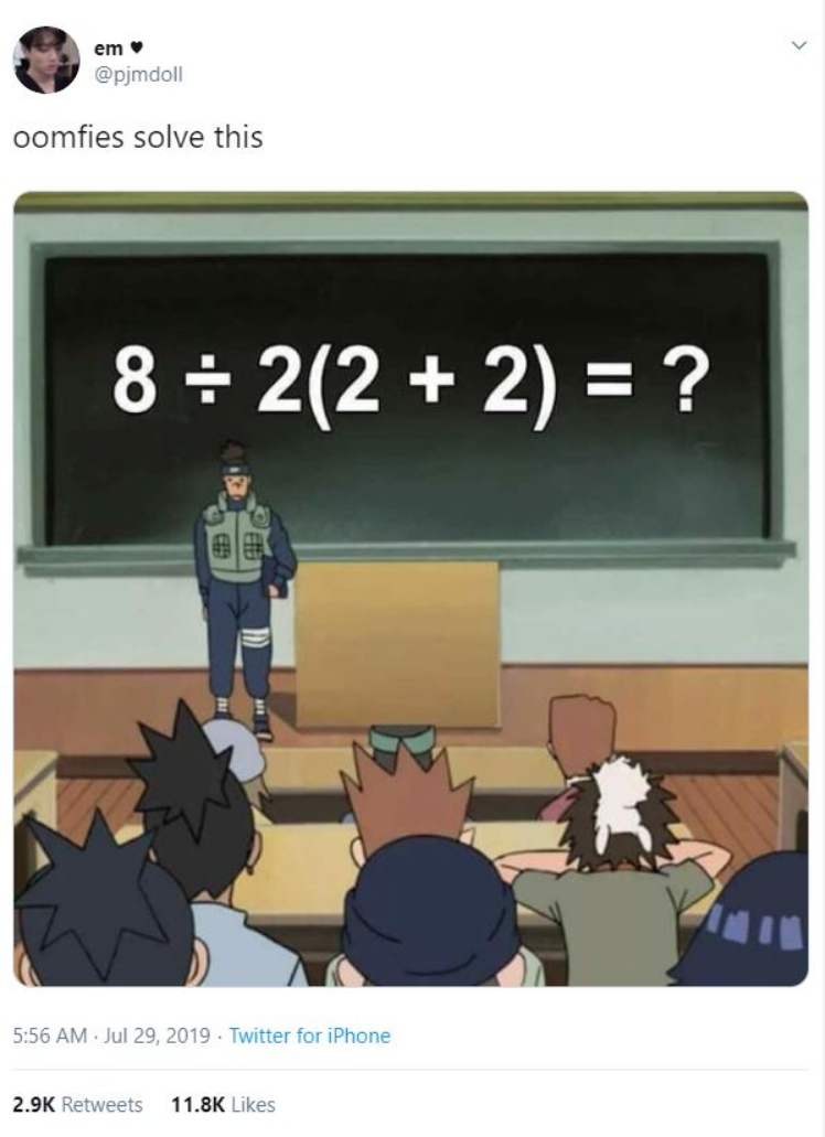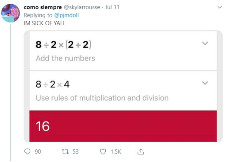 Οι άνθρωποι παίρνουν ως αποτέλεσμα δύο διαφορετικές απαντήσεις, επειδή η απάντηση βρίσκεται στον τρόπο που λύνεις την εξίσωση. Και αυτό εξαρτάται από το μέρος του κόσμου που μάθατε μαθηματικά.