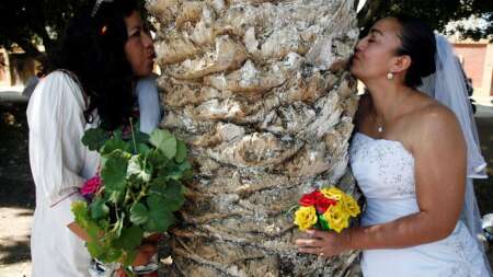 Η εκδήλωση ξεκίνησε το 2014, όταν o περουβιανός ηθοποιός και ακτιβιστής Richard Torres παντρεύτηκε ένα δέντρο στην Κολομβία και έκτοτε κάθε χρόνο γίνονται τέτοιοι… γάμοι με δέντρα σε σημεία του πλανήτη όπου απειλούνται δάση. Φέτος η περίεργη γαμήλια τελετή έγινε στο San Jacinto Amilpas στο Μεξικό με δεκάδες γυναίκες να ντύνονται νύφες και να παντρεύονται δέντρα θέλοντας να διαμαρτυρηθούν για την αποψίλωση των δασών της περιοχής.