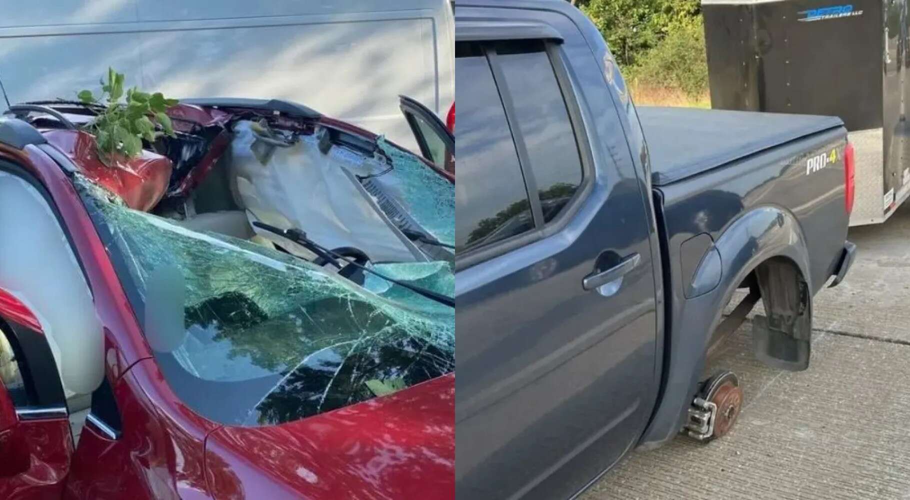 Μετά την «προσγείωση» του λάστιχου στο παρμπρίζ του αυτοκινήτου της άτυχης γυναίκας, εκείνη έχασε τον έλεγχο του οχήματος, έπεσε πάνω σε έναν φράχτη και ακολούθως σταμάτησε στην αυλή σπιτιού.