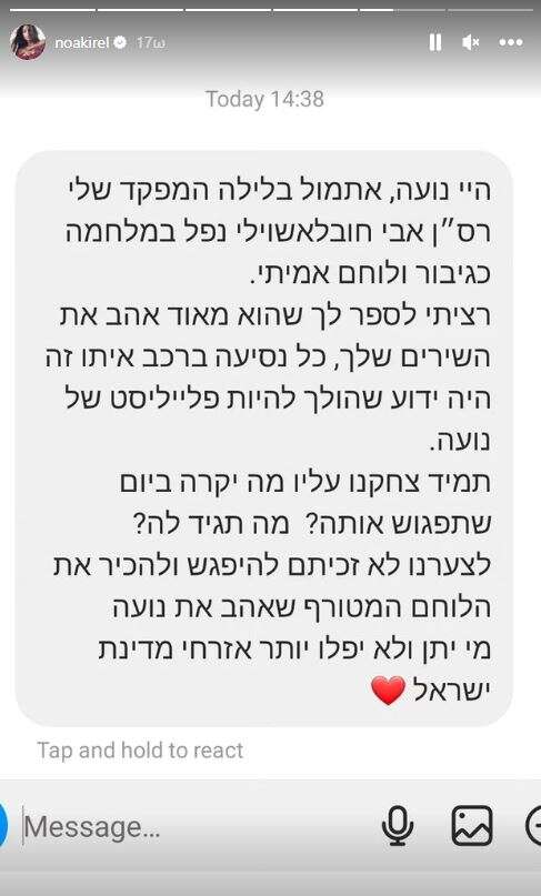 «Γεια σου Νόα, χθες το βράδυ ο διοικητής μου Ταγματάρχης Avi Hovlashovili έπεσε στον πόλεμο σαν αληθινός ήρωας και πολεμιστής. Ήθελα να σου πω ότι του άρεσαν πολύ τα τραγούδια σου, σε κάθε βόλτα με το αυτοκίνητο ήταν σίγουρο ότι θα υπήρχε μια λίστα αναπαραγωγής σου. Πάντα αστειευόμασταν, “τι θα γίνει τη μέρα που θα τη γνωρίσεις; Τι θα της πεις;” Δυστυχώς, δεν πρόλαβες να γνωρίσεις τον τρελό πολεμιστή που αγαπούσε τη Νόα».