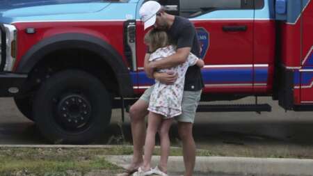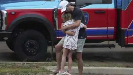 A little girl being rescued from Camp Mystic in Hunt, Texas.