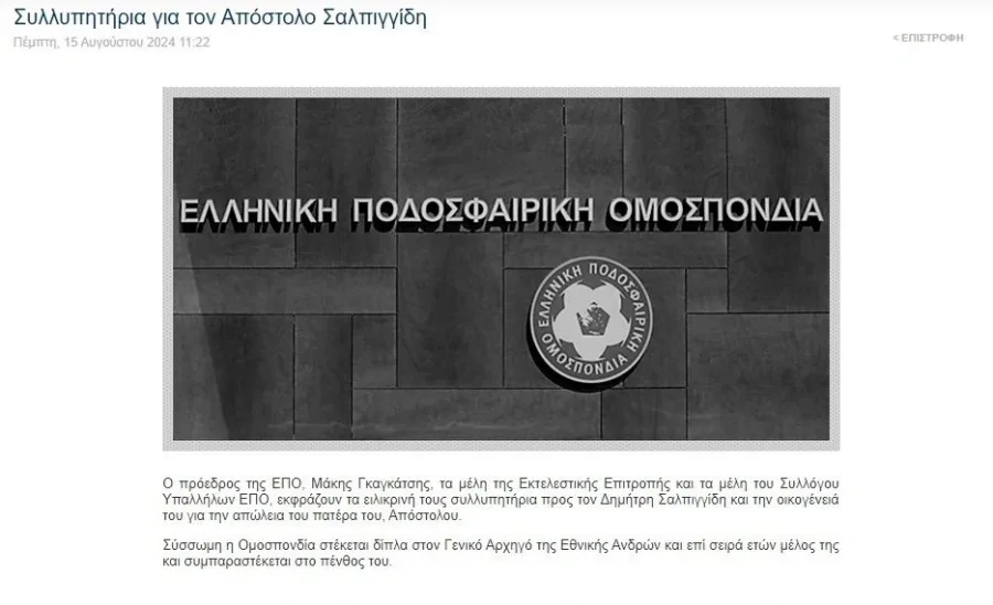 «Ο πρόεδρος της ΕΠΟ, Μάκης Γκαγκάτσης, τα μέλη της Εκτελεστικής Επιτροπής και τα μέλη του Συλλόγου Υπαλλήλων ΕΠΟ, εκφράζουν τα ειλικρινή τους συλλυπητήρια προς τον Δημήτρη Σαλπιγγίδη και την οικογένειά του για την απώλεια του πατέρα του, Απόστολου. Σύσσωμη η Ομοσπονδία στέκεται δίπλα στον Γενικό Αρχηγό της Εθνικής Ανδρών και επί σειρά ετών μέλος της και συμπαραστέκεται στο πένθος του.»