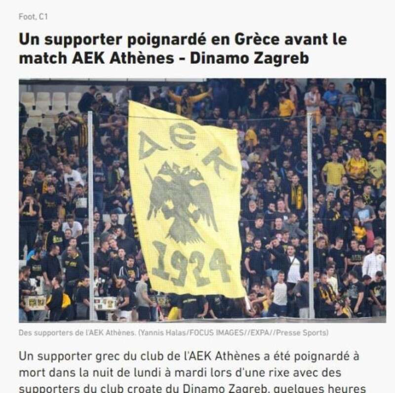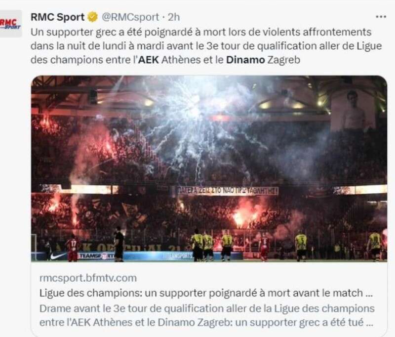 RMC (Γαλλία): Οπαδός μαχαιρώθηκε μέχρι θανάτου πριν από το παιχνίδι ΑΕΚ-Ντιναμό Ζάγκρεμπ