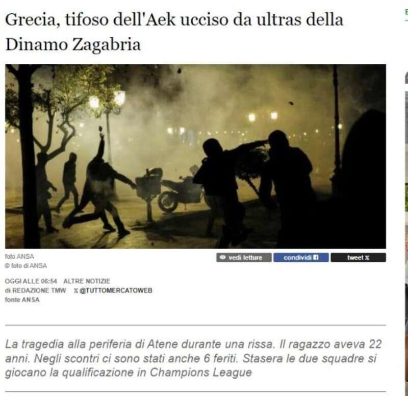Tuttomercato (Ιταλία): Νεκρός οπαδός της ΑΕΚ από οπαδούς της Ντιναμό Ζάγκρεμπ